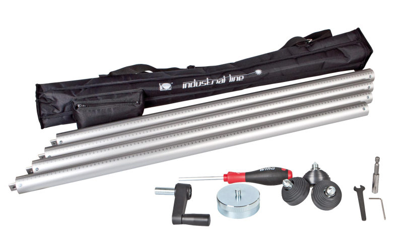Meegeleverd wordt: Schachtstatief incl. Standaard tandstang, 4 tandaselementen van elk 1 m lang in een tas, zeskantschroevendraaier SW5, magnetische bit-houder voor een accuschroef-machine, handkruk met magnetische bithouder, combi-statiefvoetjes en 3/8“ stativ-adapter